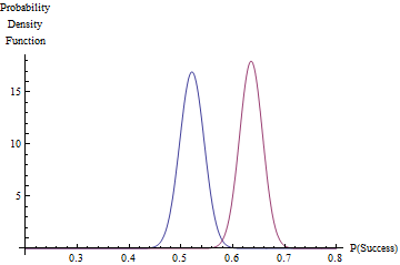 As the baseline grasp strategy for comparison, we have used grasped chosen manually by an experienced. We used 1029 grasp experiments as the basis for learning new priorities. We then tested and compared the learned priorities with those manually chosen. We found the success likelihood to be 52.1% +/- 4.6% with the manually chosen strategy (blue line) and 63.5%+/- 4.4% with the learned priorities (purple line). The uncertainties are chosen using the 95% confidence intervals. Thus, we obtain a clearly statistically significant improvement through the learning procedure, and it should be stressed again that the comparison was made with a state-of-the-art manual method.